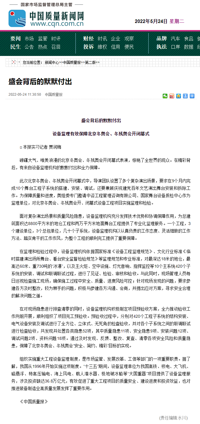 近日,中国质量报以《盛会背后的默默付出 设备监理有效保障北京冬奥会、冬残奥会开闭幕式》为题,对公司在内的设备监理机构出色地完成了北京2022年冬奥会和冬残奥会开闭幕式舞台工程施工监理及运营保障等任务进行了报道。