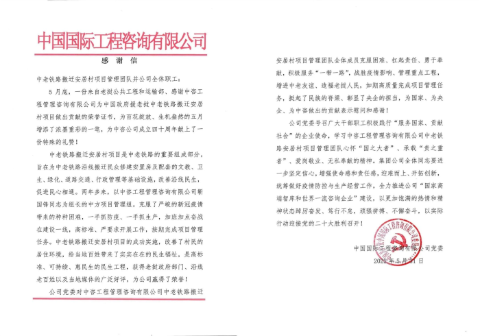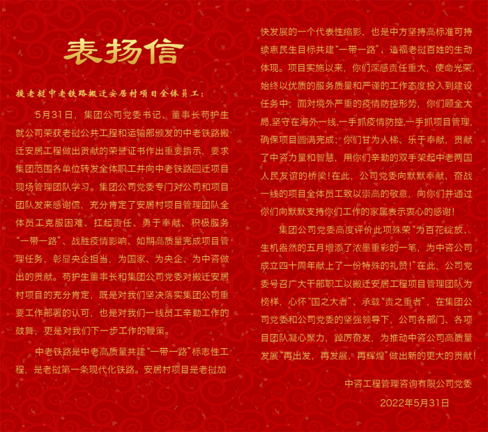 近日,老挝公共工程和运输部向我公司承担的中老铁路搬迁安居村项目进行了表彰,同时也表达了对中国政府和该项目中方管理公司及工作人员的感谢和慰问。  集团公司党委专门对公司和项目团队发来感谢信,充分肯定了安居村项目管理团队全体员工克服困难、扛起责任、勇于奉献、积极服务“一带一路”、战胜疫情影响、如期高质量完成项目管理任务,彰显央企担当,为国家、为央企、为中咨做出的贡献。  对此,中咨管理公司第一时间召开党委(扩大)会议,于6月1日下午,以视频会议的形式专题传达公司援老挝中老铁路搬迁安居村项目获老挝政府荣誉表彰有关情况,传达学习集团公司党委《感谢信》以及集团公司党委书记、董事长苟护生的指示精神,就落实集团公司党委部署提出要求。 会议指出,集团公司党委对中老铁路搬迁安居村项目的充分肯定,既是对我们坚决落实集团公司重要工作部署的认可,也是对我们一线员工辛勤工作的鼓舞,更是对我们下一步工作的鞭策。 中老铁路是中老高质量共建“一带一路”标志性工程,是老挝第一条现代化铁路。安居村项目是老挝加快发展的一个代表性缩影,也是中方坚持高标准可持续惠民生目标共建“一带一路”、造福老挝百姓的生动体现。自项目实施以来,南京分公司全体员工深感责任重大,使命光荣,始终以优质的服务质量和严谨的工作态度投入到建设任务中,面对境外严重的疫情防控形势,能够顾全大局,坚守海外一线,一手抓疫情防控,一手抓项目管理,确保项目圆满完成。彰显了中咨管理人甘为人梯、乐于奉献的无私精神,贡献了中咨力量和智慧,赢得了集团公司党委的肯定和表扬,并在中咨公司内进行广泛宣传学习。 党委书记、董事长鲁静同志代表公司党委向默默奉献、奋战在一线的项目全体员工表示了衷心感谢,再次强调了此次获得集团公司党委表扬的意义重大,尤其是在当前受疫情影响下,此项殊荣是对公司全体员工众志成城的极大肯定和鼓舞。鲁静同志在对大家的不懈付出和取得优异成绩表示感谢的同时,结合公司实际提出四方面具体要求: 一是公司各部门要第一时间把集团公司党委的感谢信传达到每一名员工。在集团公司成立40周年的喜庆时刻,集团党委的感谢信是对中咨管理公司全体员工的肯定和鼓励,大家要戒骄戒躁,把荣誉变成进一步推动工作落实的有效动力源泉。 二是在项目实施过程中,大家要进一步提高政治站位,扛起央企责任担当,积极践行“服务国家、贡献社会”的企业使命,心怀“国之大者”、承载“责之重者”,迎难而上、开拓创新,为服务国家重大工程做出更大贡献。 三是在服务国家重大战略实施方面要做出特色亮点,提升美誉度,形成品牌影响力,做成精品工程,彰显“中咨管理”品牌力量,高质量高标准护航国家重大工程顺利实施。 四是擅于挖掘、宣传、推广先进典型。公司各部门、各项目要广撒网、深发掘,广泛收集项目一线涌现出的好经验好做法,对勇挑重担、甘于奉献、群众认可的基层急先锋,要给予表彰奖励,通过积极向上的宣传报道进一步引导和激励广大员工干事创业、担当作为。 鲁静同志强调,荣誉承载过去,开拓旨在未来。每一次荣誉的获得也是我们新的起点,公司全体员工要以更加饱满的热情和精神状态踔厉奋发、笃行不怠,为推动中咨公司高质量发展“再出发、再发展、再辉煌”做出新的更大的贡献,以实际行动迎接党的二十大胜利召开! 表扬信